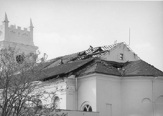 B&W photograph of the Cathedral of St. Luke and St. Paul (126 Coming Street) showing roof damage done by Hurricane Hugo.Collection