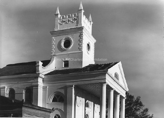 B&W photograph of the Cathedral of St. Luke and St. Paul (126 Coming Street) showing roof damage done by Hurricane Hugo.Collection