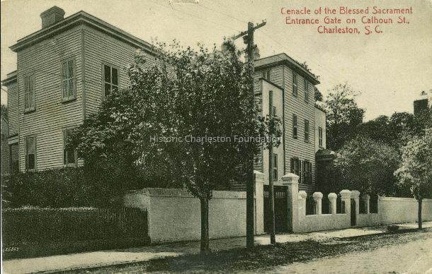 Postcard (scan) featuring the Cenacle of the Blessed Sacrament, showing the entrance gate. The building had been located at 203 Calhoun Street.Context