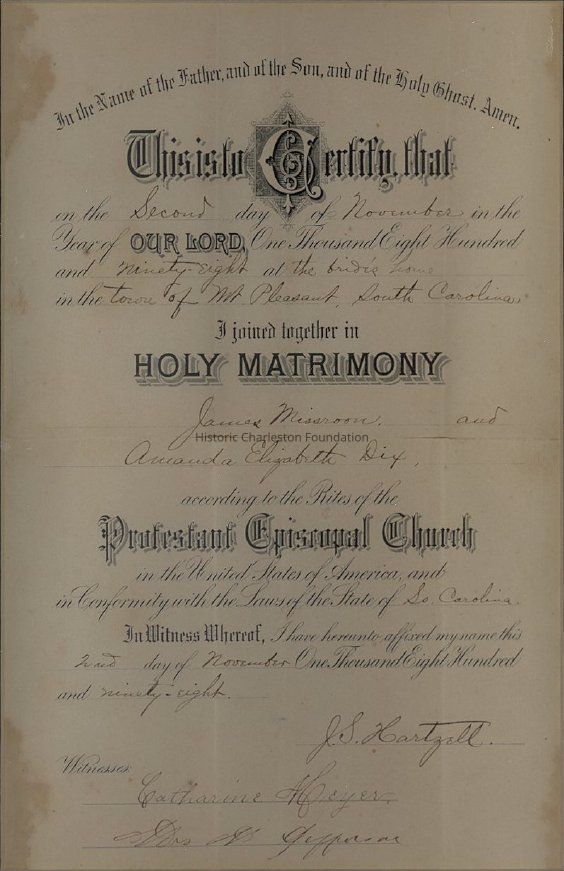 Marriage certificate of James Missroon and Amanda Elizabeth Dix. Married at the bride's home in Mount Pleasant, South Carolina, on November 2, 1898. Matted, in gilt frame.Collection