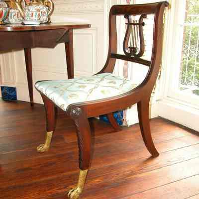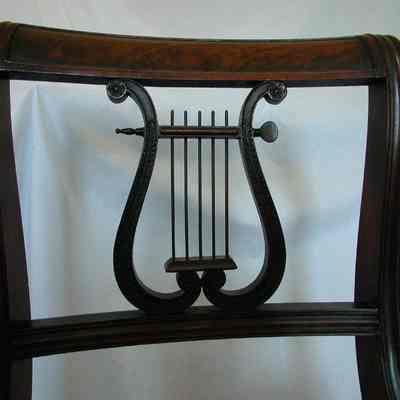 From Christie's Lot Notes: "Reflecting the young United States democratic ideals, the furniture of the early 19th century was inspired by classical Greco-Roman motifs. The lyre-back chairs offered here, with their reeded stiles and seat rails miming the Greek klismos and their natural legs and backwards-flowing fur reflecting a Roman style, are a paradigm of this trend. Although other craftsmen were producing similar chairs during this period, the high quality of carving of these chairs indicate the work of Duncan Phyfe. A sketch attributed to Phyfe that was attached to a bill dated 1816 to Charles N. Bancker of Philadelphia illustrates the earliest American design of a lyre-back chair with tablet. Additional support of the Phyfe attribution can be found in the 1816-1817 watercolor painted by John Ruben Smith, where two women in Duncan Phyfe's New York City shop and warehouse admire two lyre-back chairs such as these."General Notes