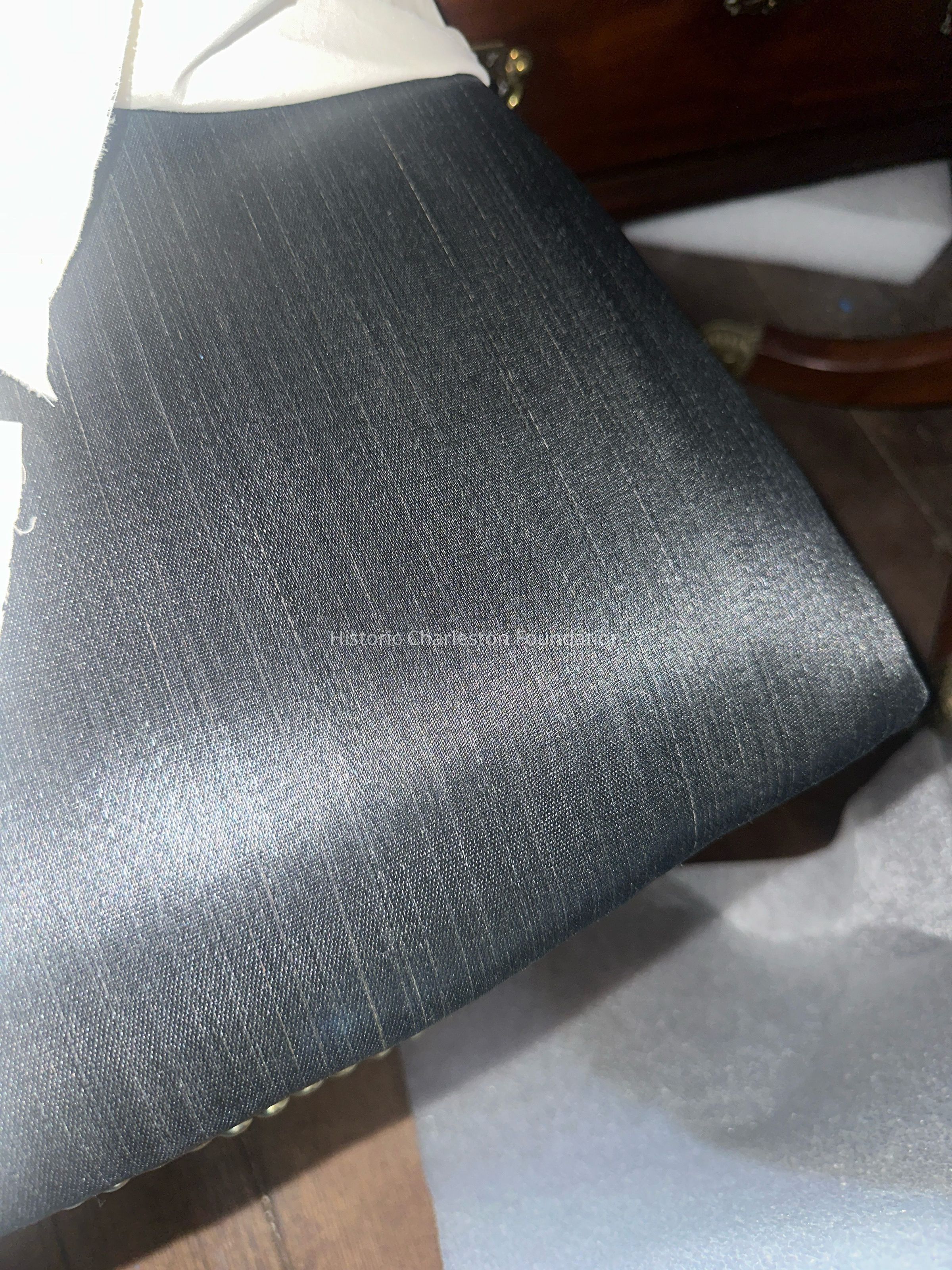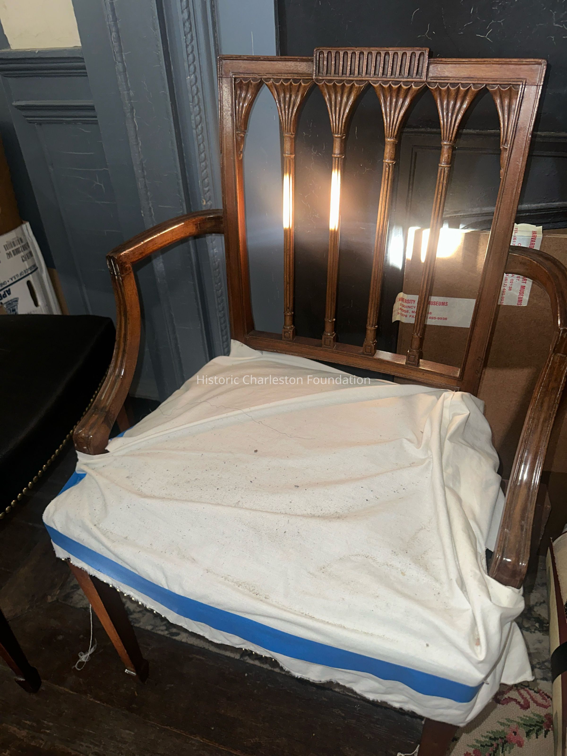Used in the "Governor's pew" of St. Michael's Church and gifted by the Vanderhorst family, the set is possibly the largest known extant grouping of chairs with a Charleston association. Seating furniture of a similar design was described in the 1802 New-York Price Book as "Square Back" chairs "With gothic arches, and four turned columns…plain taper'd legs." Alicia Hopton Middleton, granddaughter of Nathaniel Russell Middleton, owned a Federal-style chair with gothic arches, and this object is pictured in an interior view of her family plantation, Hey Bonnie Hall in Bristol, Rhode Island (see image). The stylistic similarities between these Charleston chairs and New York examples, such as those also displayed in the Russell House dining room, prevent scholars from determining a clear attribution. However, it is highly likely these chairs were made in Charleston. The four Vanderhorst family chairs would be an excellent addition to the collection and enhance our interpretation of the Russell House dining room, where the six dining chairs on loan from St. Michael's are currently exhibited.Collection