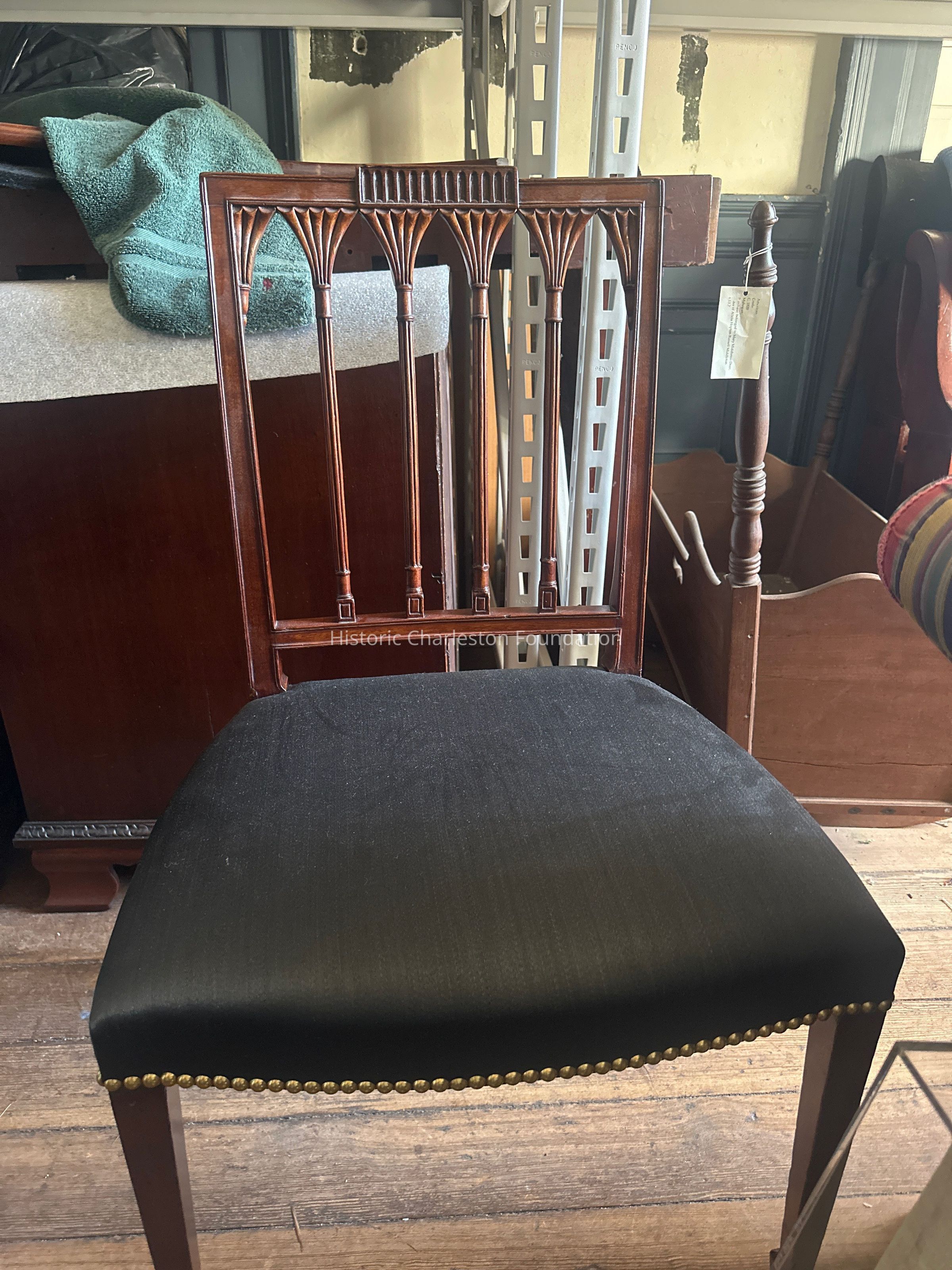 These chairs are a part of a set of twelve or more dining chairs, six of which are in the Museum of Early Decorative Art's (MESDA) collection and the remaining examples exhibited within the Nathaniel Russell House Museum. MESDA is offering four examples from their collection to Historic Charleston Foundation with the intention of reuniting the set. Because of the significance of these chairs, MESDA will keep two side chairs for display in their galleries. This set is well documented, and additional information can be found in The Furniture of Charleston.