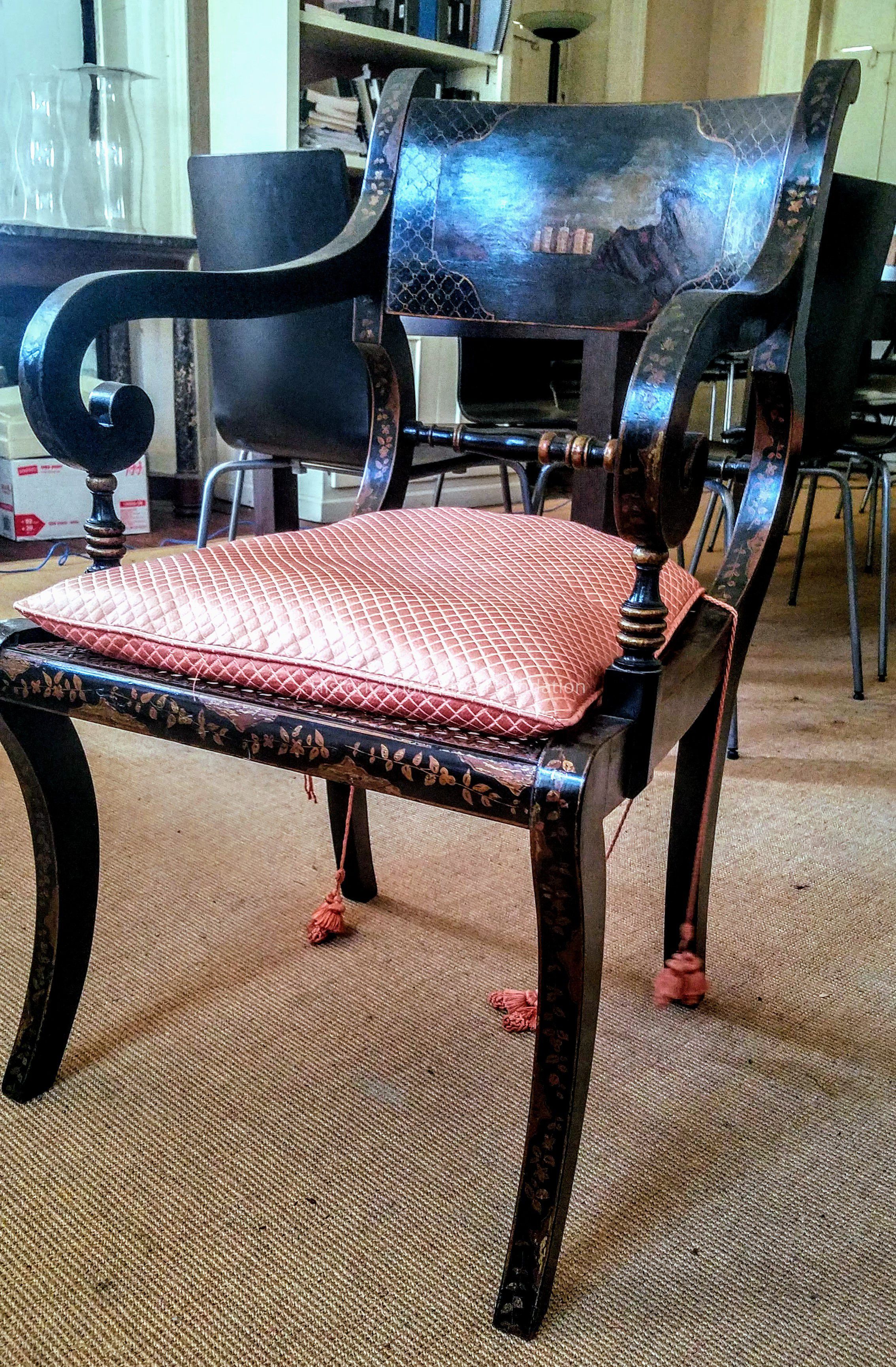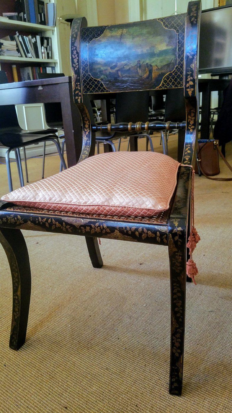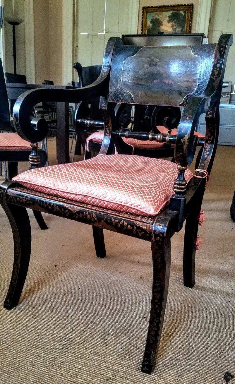 Part of the Pinckney family's English suite of seating furniture, having tablet back painted with English landscape and pastoral scenes, above turned splat, on sabre legs; armchairs having scroll arms resting on turned supports.Collection