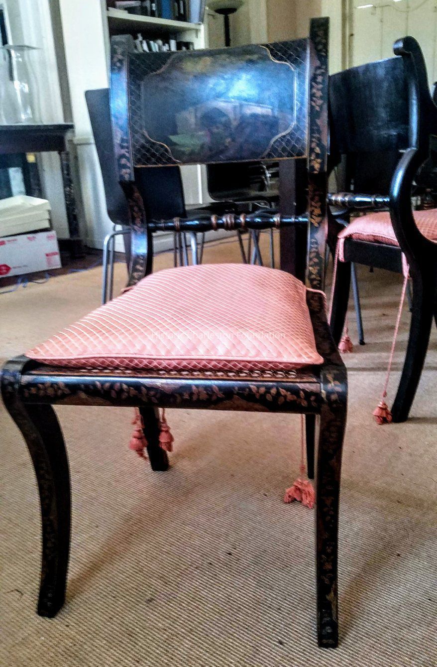 The four chairs are decorated with English landscapes and thus were likely ownd by Charles Cotesworth Pinckney, who was born into a wealthy South Carolina rice planting family in 1746. An 1802 invoice from the London firm of Bird, Savage, and Bird to Charles Cotesworth Pinckney details what are possibly the chairs from this Japanned suite. The four chairs were purchased by Mrs. Rudisill's parents in the mid 20th century.Research Notes