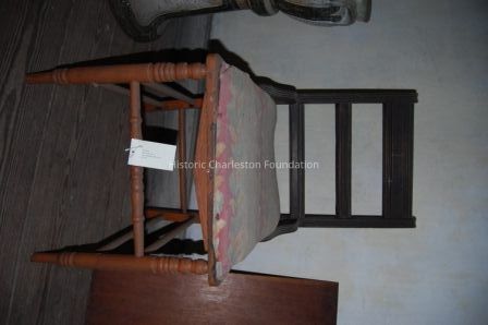 Bottom front stretcher missing, caned seat completely busted and new seat has been nailed over caning; seat, legs and stretchers have been painted a brownish/red colorCreated By