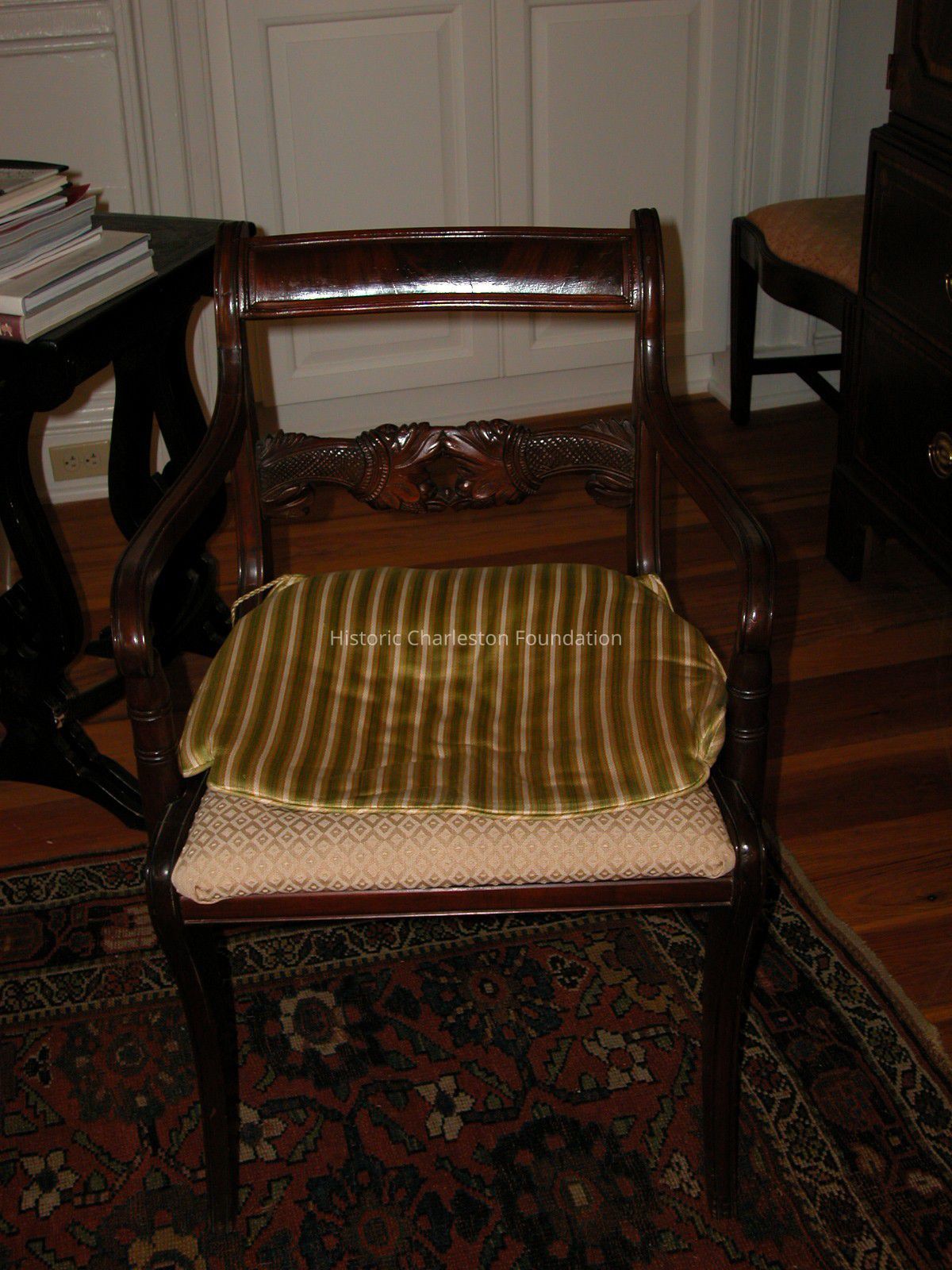 Arm chair, after the American Classical type, mahogany, having scrolled tablet crest with panel above a pierced and carved floral and friut splat flanked by scrolled and molded arms continuing to 'C'-curved supports over an upholstered trapezoidal seat above molded sabre legs.Collection