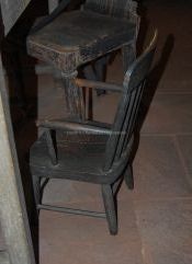 Child's chair having straight crest rail with rounded corners, over six turned spindles, turned arms on turned supports, shaped plank seat, over turned legs with box stretcher; crest rail painted with birds, leaf and scroll decoration.Collection