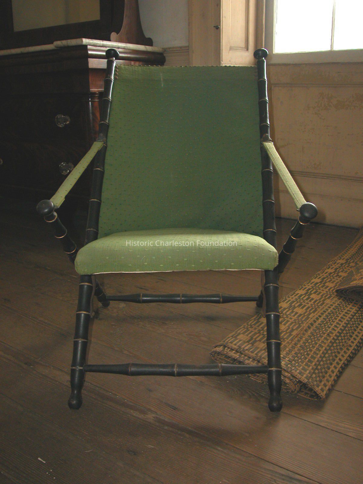 having arch-shaped crest with brass furniture tacks, flanked by bamboo style supports with gilt decoration and knob finials which continue into front legs with single stretcher, shaped seat flanked by identical supports that continue into back legs with single stretcher; front and back supports attached with clips to strap that function as pseudo arms and keep chair from collapsing once seated; upholstered in green material with dots; two iron supports connect front leg to seat, right support impressed 'P.J. Hardy N.Y.', left support impressed 'PAT. DEC 22 63'.