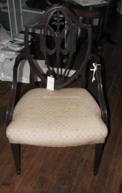 Pair of side chairs, Federal, New York, c. 1800, mahogany: each having molded square back centering a splat comprising carved Prince of Wales feathers, swags, tassels and water leaves, the over-upholstered slightly bowed seat, on molded square tapering legs ending in spade feetCollection