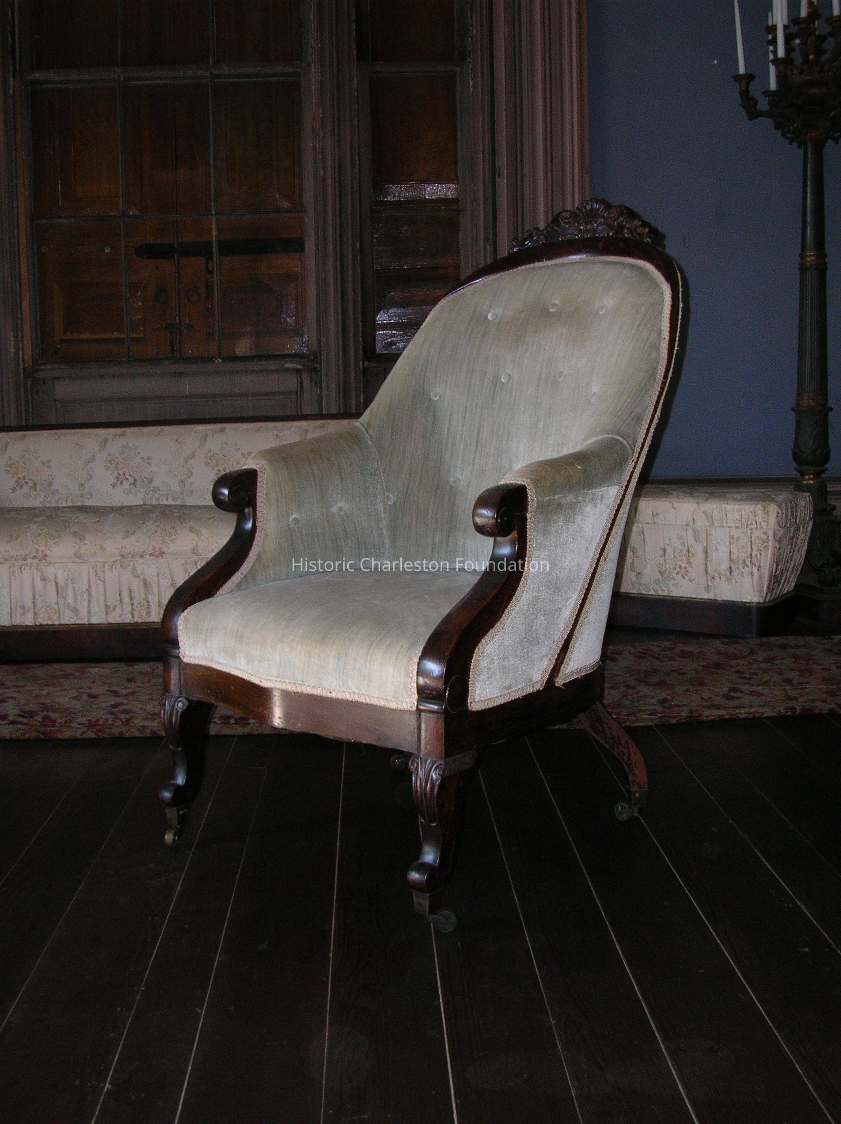 One upholstered wing-bank chair, Rococo revival style, mahogany, likely of New York manufacture, circa 1840-1860.. From the front drawing room at the Aiken-Rhett House.