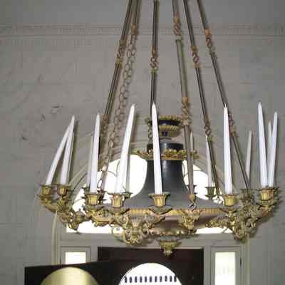 Gilt Bronze Empire Chandelier fitted with 18 candle sockets. French, c. 1830. All cast sections are of gilt bronze. Brass body sections lacquered. Convex lower brass pan holds 6 suspension sections and 6 triple candle socket extensions. Lower section of pan decorated with large gilt floral disk and smaller finial sections. Large upward curving top disk separated from lower pan by gilt bronze leaf band. At top of upper body are two gilt bronze rings, the upper one in leaf design. Brass dome fits inside top leaf ring. Gilt bronze urn rests on top of dome. Candle arms are elaborate floral design with removable drip pans around candles. Suspension rods consisting of brass sleeve and gilt bronze ends secured together with iron rod. Three such rods joined together with "S" hooks attached to each of the six suspension sections and the companion gilt suspension rings from top suspension section. Top suspension section has ring at top center for hanging from ceiling and two gilt bronze bands, the top in leaf form, the lower band is a simple base to which the decorated suspension rings are attached. Underside of top suspension section has concave brass disck with gilt floral disk underneath and smaller finial sections at center.