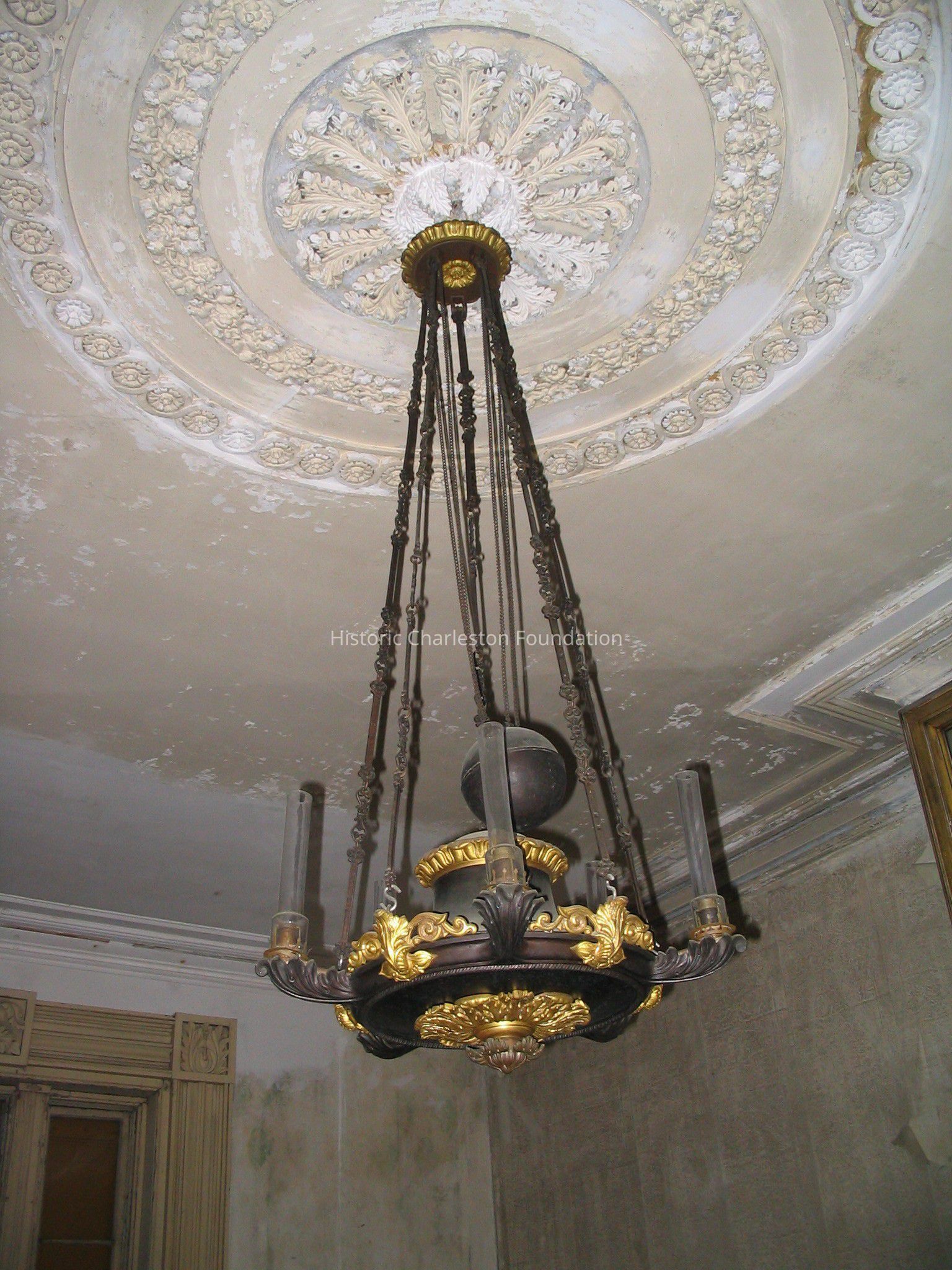 Whale Oil Argand . suspended by five link wrought iron straps, body having center pedestal with leaf scroll edge, circular body havinh applied flower, leaf and scroll ormalu decoration interrupted by five leaf scroll cast iron armsholding burners; bottom center having ciruclar ormalu medallion decoration with circular drop leaf decorated finial, having center cast iron ball suspended by four chains. Five glass chimneys extant.Collection