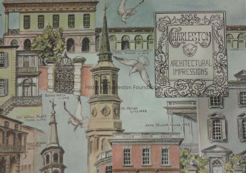 Buildings featured include St. John's Lutheran Church bell tower; Porter's Lodge (College of Charleston); William Gibbes House (64 South Battery); The Old Exchange (122 East Bay); Market Hall; William Rhett House (54 Hasell); Sword Gate House (32 Legare); St. Philip's Church spire; John Stuart House (106 Tradd); Heyward-Washington House (87 Church); Cabbage Row (91 Church); Dock Street Theater (135 Church); St. Michael's Church spire; Nathaniel Russell House (51 Meeting); Pink House (17 Chalmers); Mikell House (94 Rutledge); Thomas Rose House (59 Church); Powder Magazine; Miles Brewton House (27 King); Simmons-Edward House (14 Legare); and Lining House (106 Broad).Collection