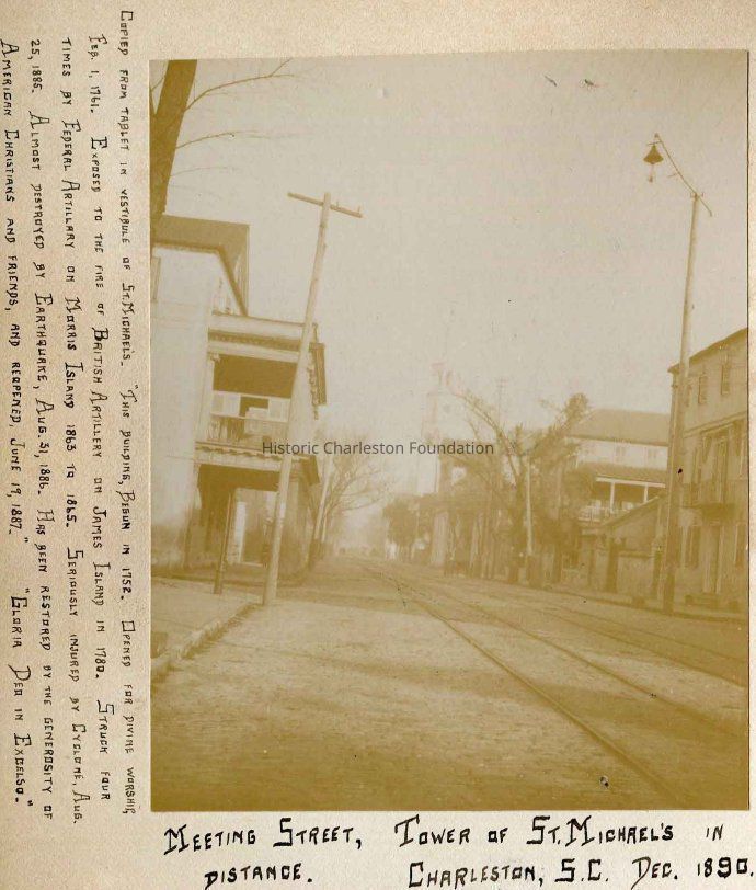 a: View north on Meeting Street from Tradd Street showing 59 Meeting Street at left and 60 Meeting Street and beyond at right. Shows 60 Meeting Street before it was remodeled to add Victorian features. Captioned "Meeting Street, Tower of St. Michael's in distance. Charleston, S.C."