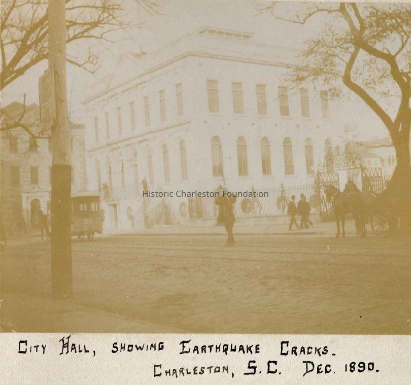 b: View of City Hall from across the street on Broad Street, showing the southeast elevations. One horse-drawn carriage is in front of building and one is stopped by the gate to Washington Square Park. Pedestrians on the sidewalk and crossing the street. A portion of the east elevation of the County Courthouse is at left. Captioned "City Hall, showing earthquake cracks. Charleston, S.C."