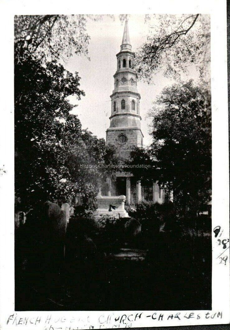 a: View of St. Philip's Church from the graveyard across the street. Captioned "French Huguenot Church, Charleston, Calhoun Tomb" in error and dated Sept. 28, 1929.