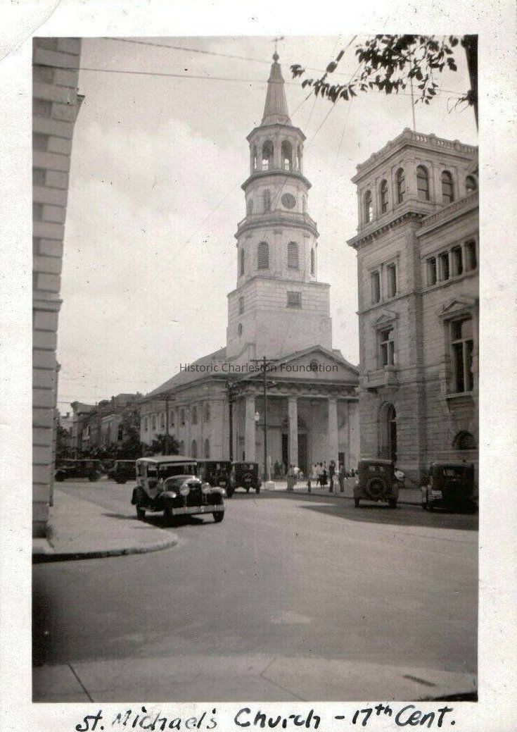 b: St. Michael's Church seen from across the street near the Charleston County Courthouse. Also shows a portion of the U.S. Courthouse and Post Office. Cars and pedestrians in the vicinity of the intersection of Broad and Meeting Streets. Captioned "St. Michael's Church, 17th cent[ury]."