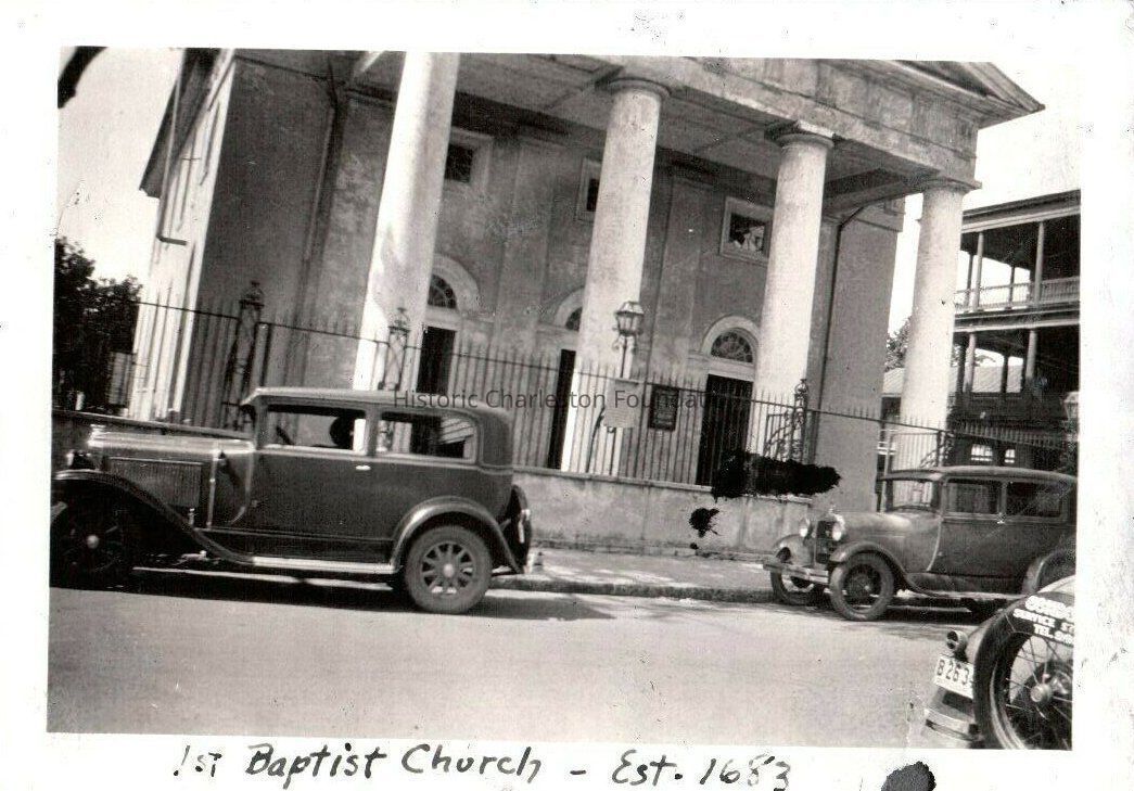 c: First Baptist Church seen from across the street. Cars parked in front. Captioned "1st Baptist Church, est. 1683."