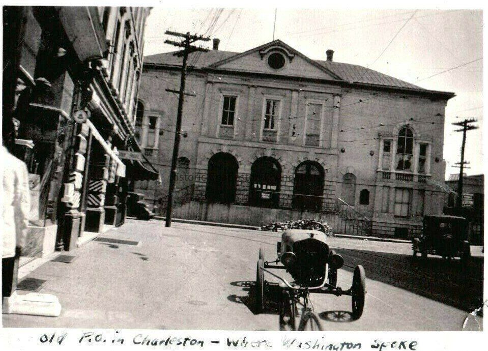 d: View east on Broad Street featuring the Old Exchange Building. A portion of 2 Broad Street at left; "Shoe Shine" sign projects from the building. Sign for a cotton broker (Pringle) that would have been on Exchange Street at the right of the Old Exchange. Two cars and a bicycle are on the street. Captioned "Old P.O. in Charleston where Washington spoke."