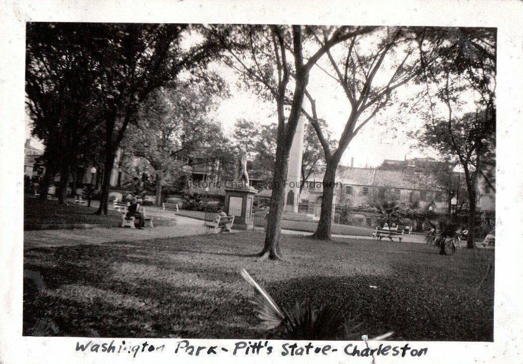 f: View looking east across Washington Square Park showing the statue of William Pitt and the Washington Light Infantry Monument in the mid-ground. Captioned "Washington Park, Pitt Statue, Charleston."
