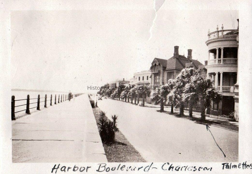 h: View south on East Battery from 27 East Battery. Sea wall at left, houses on the street lined with Palmetto trees. Captioned "Harbor Boulevard. Palmettos." (Print not available; jpg only.)Collection