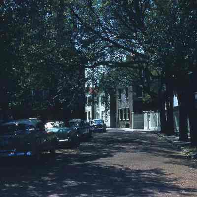 k: Catfish Row (89-91 Church Street). Cars parked in front of building. Slide dated December 1959.