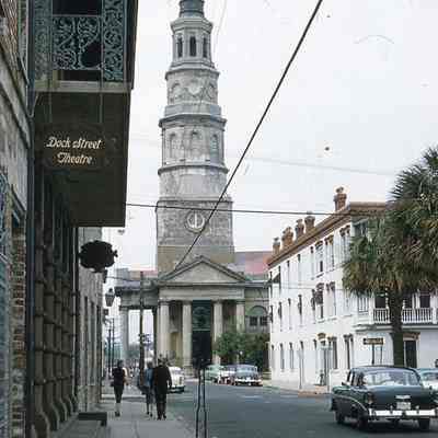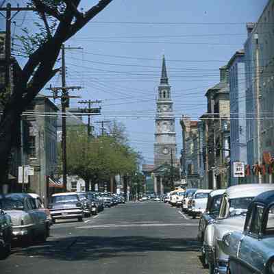 l: View north on Church Street from the Dock Street Theater (135 Church) to St. Philip's Church. Cars on the road and parked on the street.