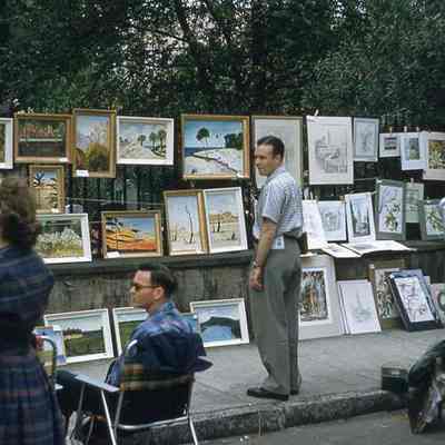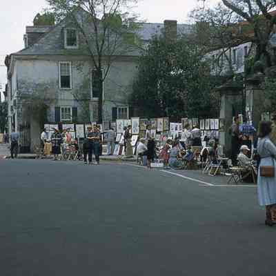 n-o: Two slides featuring an art show along the sidewalk outside the gates of the St. Philip's Church Cemetery. North elevation of the Alexander Perroneau Tenement (145 Church Street) and cars can be seen at the left of Photo N .