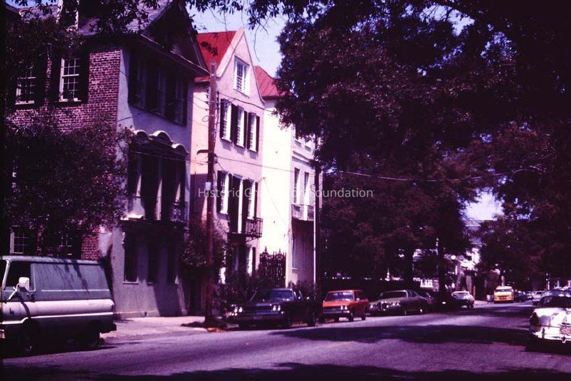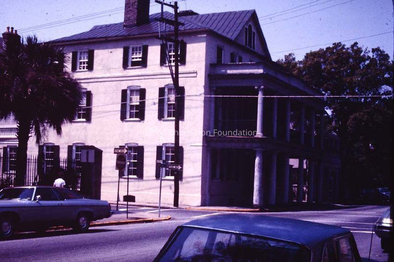 k: View of the Branford-Horry House (59 Meeting) from across the street looking northwest, showing the east (front) and south elevations and the street corner (corner of Meeting and Tradd Streets),