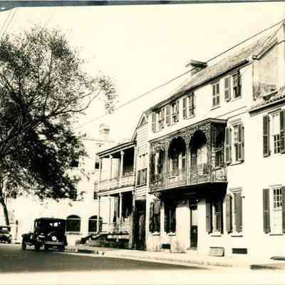 e. Carriage building of the Miles Brewton House (27 King Street). Street vendor is walking on the street in front of the building. "Coach house and Negro quarters of Pringle House" handwritten on back.