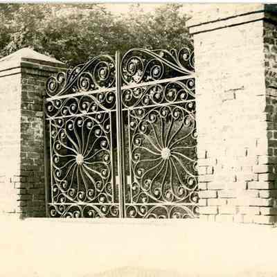 c: Wrought iron gate at Ashley Hall (172 Rutledge Avenue). "Wheel Gate of Ashley Hall" handwritten on back.