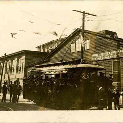 h: View of corner of East Bay Street at Columbus Street featuring the Cigar Factory office building (picker house) and the General Asbestos & Rubber Company (GARCO) building. A small portion of the Cigar Factory building can be seen between these two buildings. A trolley car bound for King Street is stopped in front of the GARCO building, with several sailors aboard. Other individuals who appear to be factory workers are standing by.
