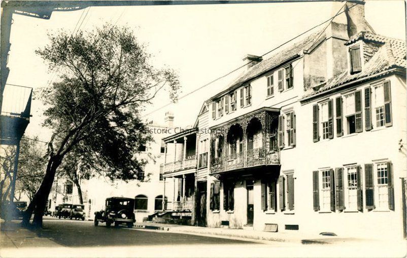 a: View West on Hasell Street from Meeting Street. Features three men standing under the balcony of the Argyle Hotel. Buildings from 81 Hasell to King Street at right.