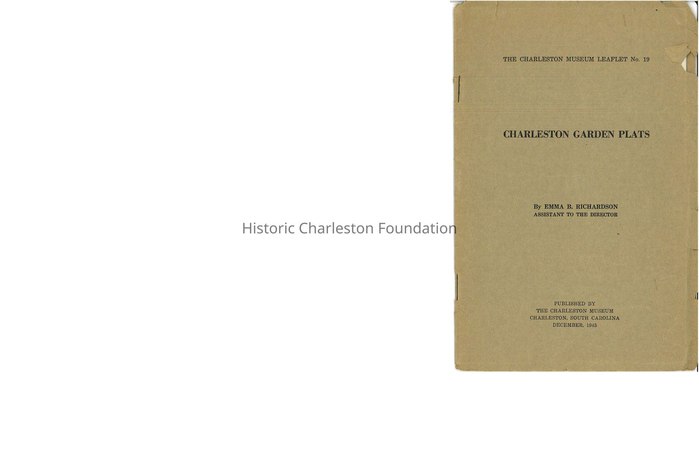 Describes a number of city and country gardens, illustrated with historic plats. "City Gardens" include: Henry Peronneau's Garden, Meeting Street; Edith Mathews's Garden, Blake Tenements (4 Courthouse Square); Florian Charles Mey's Garden (now lost), between Pinckney Street and Hard Alley; John Julius Pringle's Garden, 70 Tradd Street; Judge Elihu Hall Bay's Garden, 76 Meeting Street; A Garden on Tradd Street (south side); Alexander Inglis's Garden, 82 Queen Street; James Gregorie's Garden, 28 Broad Street; Orphan House Garden, Calhoun Street (f/k/a Boundary Street); Samuel Adams's Garden (block between Congress Street, Ashley Avenue, Huger Street, and Wesson Avenue; Samuel Prioleau's Garden, 71 Church Street; Thomas Bradford's Garden, 76 Church Street; Tradd and Legare Street Gardens; William Grogan's Garden, Wentworth Street.