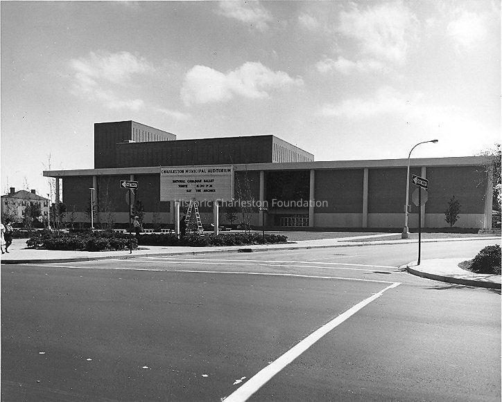 B&W photograph of the view looking east from Anson Street of the Charleston Municipal Auditorium (now Gaillard Auditorium), showing west elevation of the building and the corner of George Street. Sign for the "National Canadian Ballet Tonight at 8:30" and Saturday: The Archies" in front.Collection
