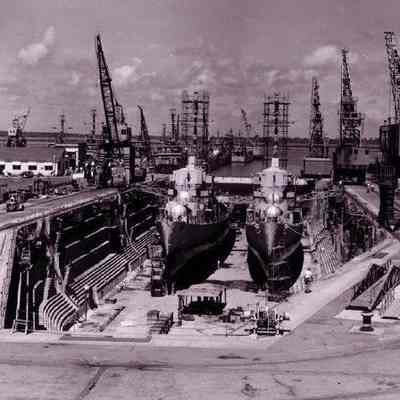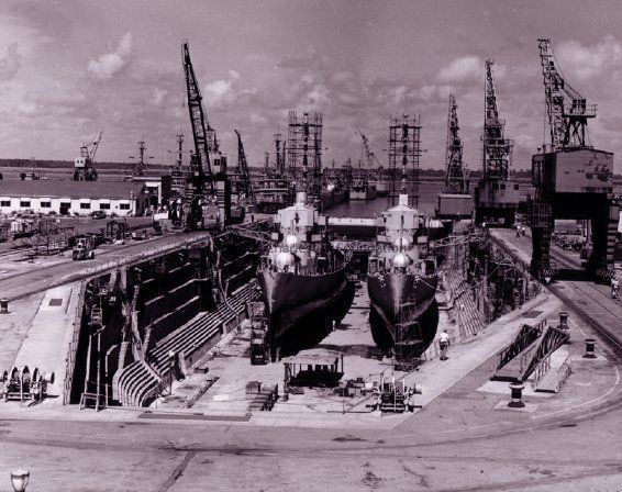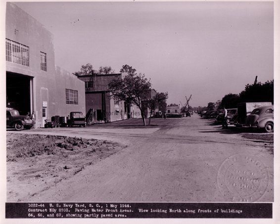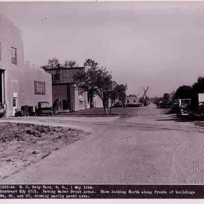 U.S. Navy Yard, S.C. 1 May 1944 / Contract NOy 8703. Paving water front area. View looking North along fronts of buildings 64, 66, and 67, showing partly paved area.