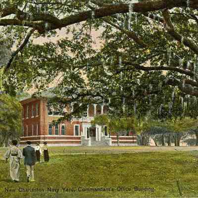 a-b: Two views of the Administration Building. Photo A is captioned on back: "This is the old Colonial Trumbull Home remodeled and adapted to the needs of the commandant of the new Naval Station." Photo B is titled "New Charleston Navy Yard, Commandant's Office Building," and created by the Hugh C. Leighton Co. The Charleston Naval Shipyard began operations in 1901; these views represent that time period.