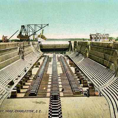 c-d: Two views of Charleston Navy Yard Dry Dock. Photo C is captioned on back: "Dry Dock at Navy Yard. The Dock proper which was completed March 1909 is a complete stone dock and built of South Carolina Granite. Length 608 ft. - width between coping 194 ft. - width of floor 80 ft. - depth 42 ft." Photo D is captioned on back: "First vessels to enter dock April 7th, 1909. Forward vessel is the Naval Tug Potomac, directly behind her is the Ferry Tug Kite, followed by the Commandant's Steamer Courier. On either side of the Courier is a real barge."Collection