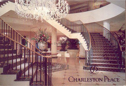 Lobby at Charleston Place (color photographic print). Features chandelier, staircase.Collection