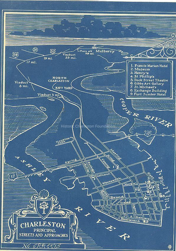 Peninsula map showing Charleston's principal streets and approaches, including a few points of interest.