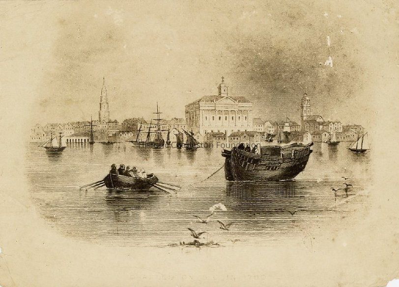 Photographic reprint of the engraving "Charleston, S.C. in 1780" showing a view of the Charleston harbor and waterfront. Rowboat towing a barge in foreground. Sailboats and Charleston buildings in the background, including St. Michael's Church, the Old Exchange, and St. Philip's Church.
