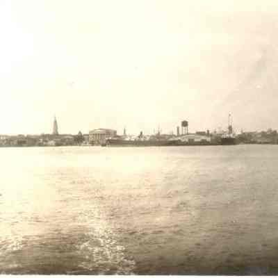 Photo 2: View of the Charleston waterfront from the Ashley River. Some of the landmark buildings visible in the background include St. Matthew's Church, Francis Marion Hotel, St. John's Lutheran Church, Unitarian Church, St. Philip's Church, People's Building, St. Michael's Church, and West Point Rice Mill.