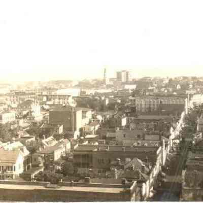 Photo11: Looking east on Calhoun Street, possibly from the Francis Marion Hotel, toward the Cooper River. Landmarks include the Calhoun Monument in Marion Square, Citadel Square Baptist Church, Emanuel A.M.E. Church. Other identified buildings include 316 Meeting and 314 Meeting, and the Zion Presbyterian Church (123 Calhoun).