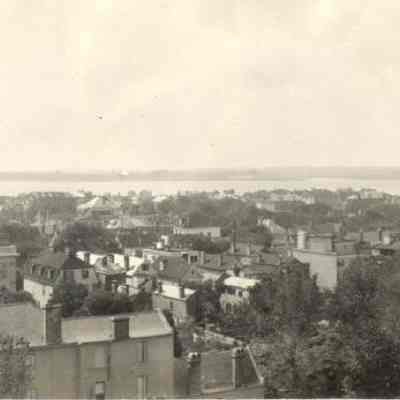 Photo 8: Looking southwest, possibly from St. Michael's Church, toward James Island. Landmarks include the Fort Sumter House (1 King Street), Col. John Ashe House (32 South Battery), rear of First Scots Presbyterian Church (57 Meeting Street), Miles Brewton House (27 King Street), and the north elevation of the John E. Poyas House (69 Meeting Street).