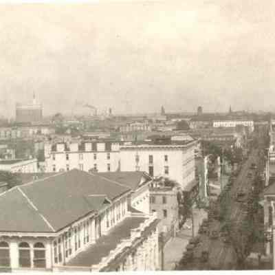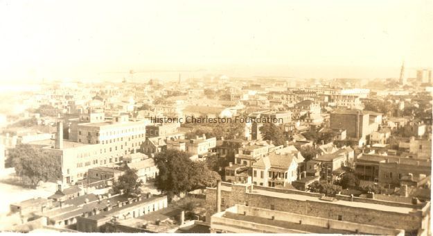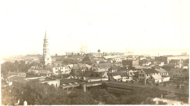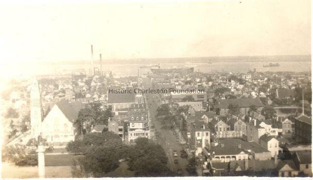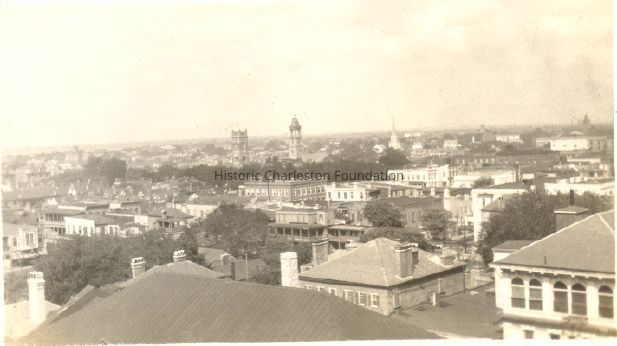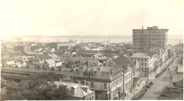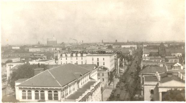 Photo 6: Looking southeast, possibly from the Francis Marion Hotel, with Meeting Street bisecting the view at a diagonal. Landmarks include the U.S. Customs House, Charleston Hotel, People's Building, and St. Philip's Church.