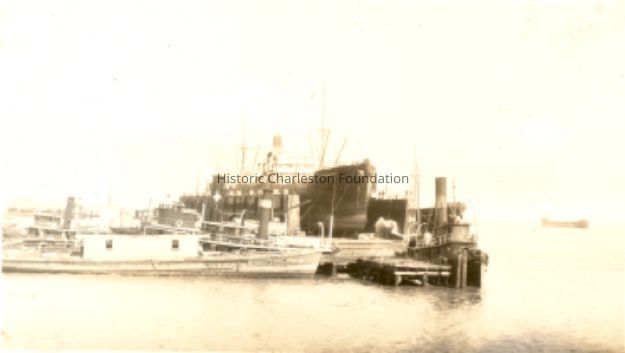 Photo 1: Tugboat and other ships in a floating dry dock in the Charleston Harbor (possibly Charleston Shipbuilding).