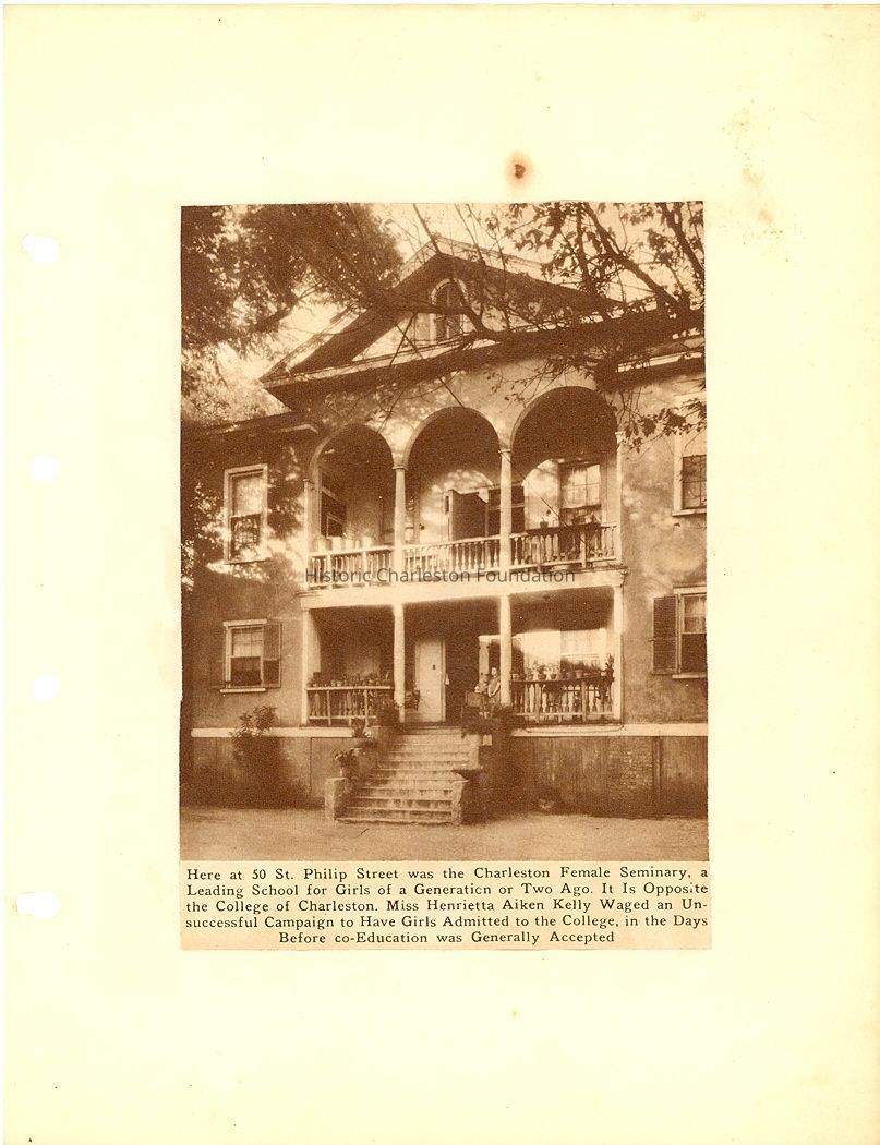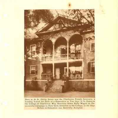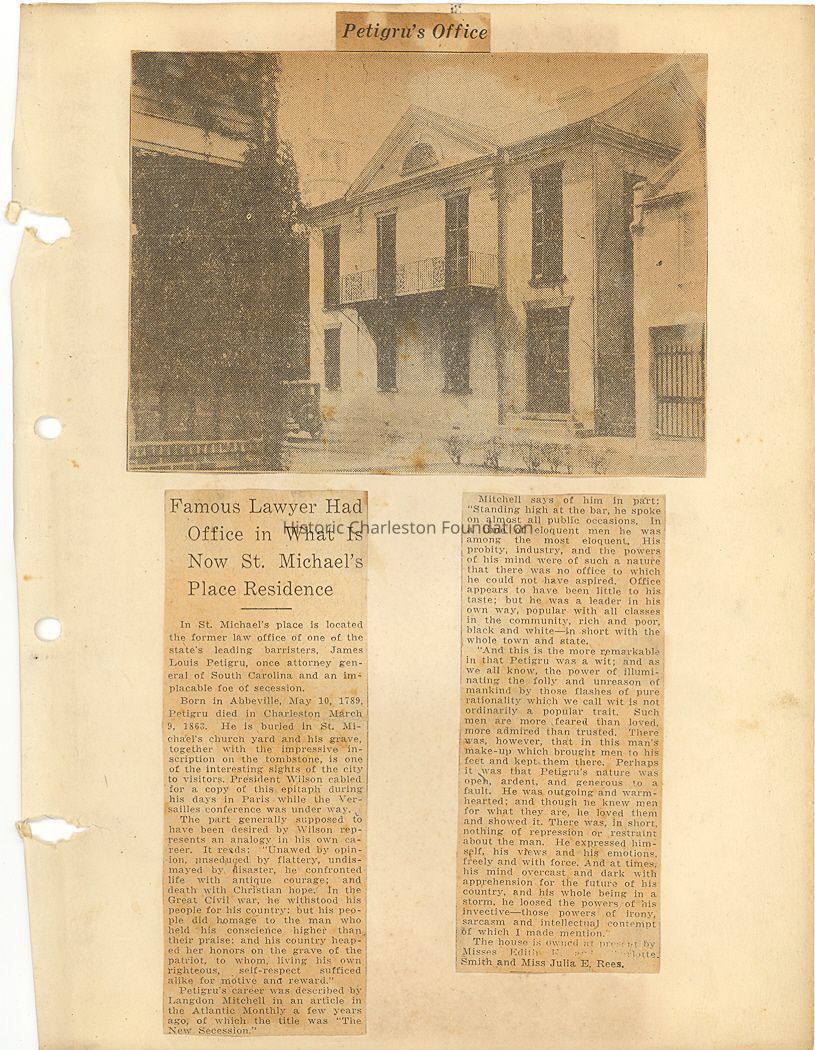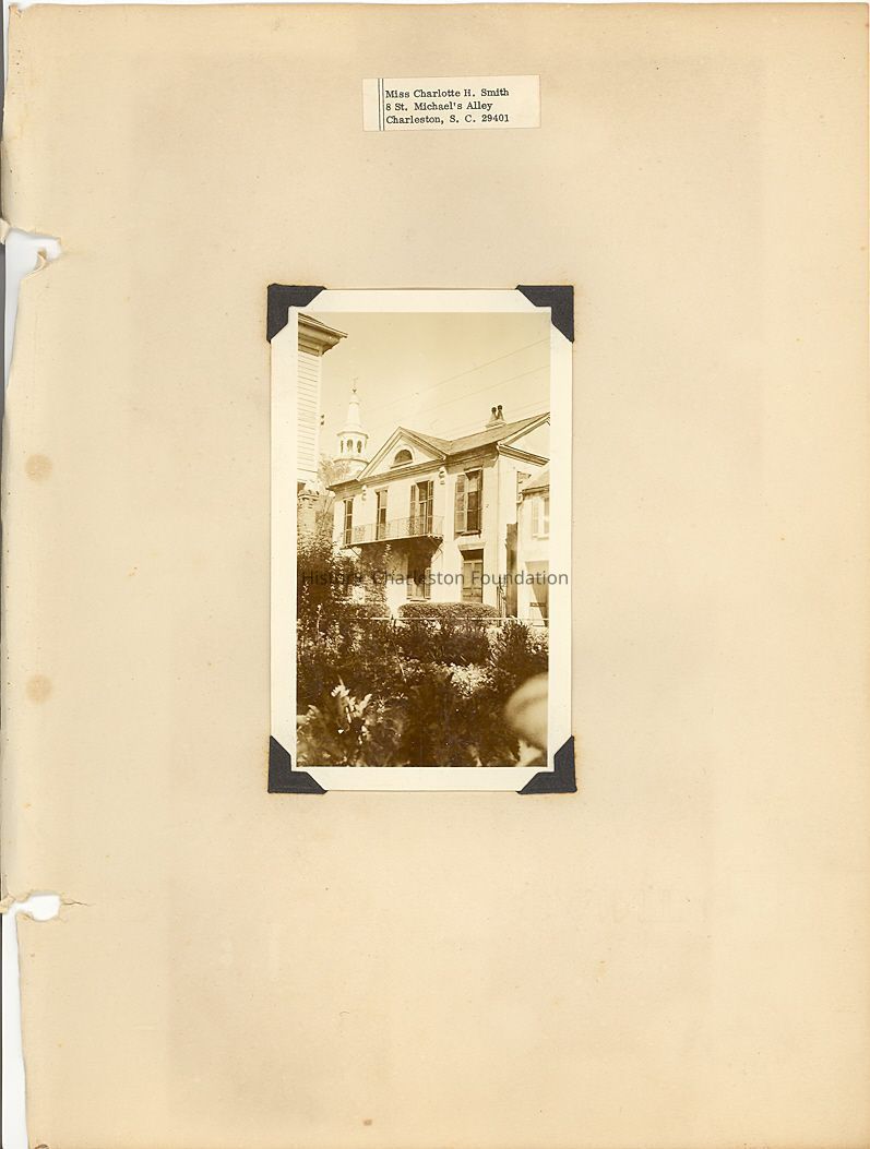 Scrapbook compiled by Miss Charlotte H. Smith, a client of the donor who came into possession of it after Miss Smith died. Consists mostly of newspaper and magazine articles glued to pages. Many are captioned photographs of various Charleston houses and buildings, many of which were clipped from the News & Courier's "Charleston Pictorial Exhibit" (November 1937, photos by Frances Benjamin Johnston) (see 2007.020.9 and 18); articles about notable Charleston persons, history, and attractions; and two maps. There are some articles loose in the file. Miss Hill resided at 8 St. Michael's Alley (site of James L. Petigru's office) and there is a photograph of the building and articles about it and Petigru. Very few items are dated; however, the earliest date indicated is 1936 and the latest 1965. Because of the poor condition of the pages (stained, fragile, and acidic) and of the binder, the pages were removed from the binder and may be photocopied and/or scanned and dispersed throughout property and other relevant files. Sample pages have been scanned for this record.