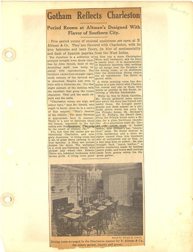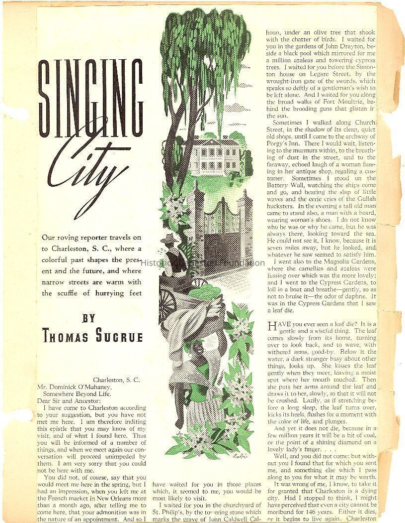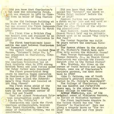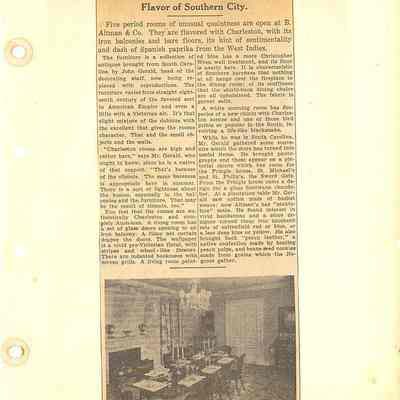 Also contains miscellaneous articles about life in Charleston, including: Charleston called 'most illusive city in America by North Carolina writer; ironworkers in Charleston; Charleston rated Outstanding by New York Motor Club Magazine; interior decoration in Charleston houses (Ladies Home Journal article, March 1936); city church bells (St. John's Lutheran, First (Scots) Presbyterian, St. George's Winyah, Second Presbyterian); Charleston rooms reflected at B. Altman (dept. store); Charlestonian cuisine; and more.