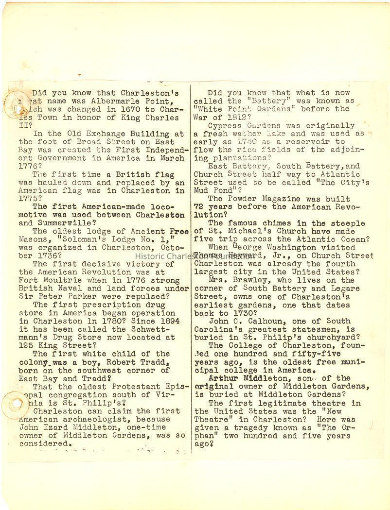 Loose items include street map of Charleston; brief history of Charleston from a calendar; the painting of fire hydrants to resemble "Redcoats"; newspaper photograph of the faculty of Memminger High School (1949); and obituary of Dorothy Heyward.